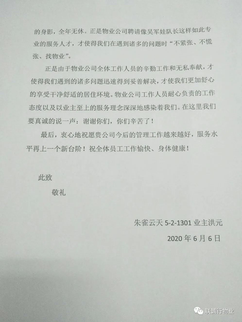6月6日,【朱雀云天】管理處收到一封來自5-2-1301業(yè)主洪元的感謝信。信中肯定了物業(yè)工作人員在提升小區(qū)環(huán)境、完善設施設備、處理緊急問題等方面做出的努力和成果,并對物業(yè)工作人員吳軍娃熱情認真的服務態(tài)度給予了高度評價與贊揚。 業(yè)主送來感謝信