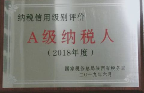 2018年 國(guó)家稅務(wù)總局陜西省稅務(wù)局“A級(jí)納稅人”。
